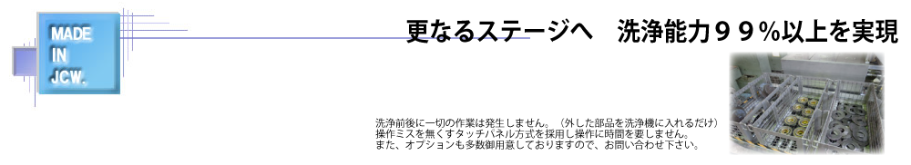 部品・大型ベアリング(軸受)洗浄装置、ベアリング洗浄世界最大処理能力(37.5秒/PC)を達成!(仕様変更により更に短縮可能)新開発高圧洗浄サイクロンアクションにより、 汚れ(グリース)の種類に関係無く、従来機では考えられなかった、洗浄能力を実現(残油分1%以下 残水滴1%以下)。ベアリング以外の部品 も洗浄可能となり、洗浄~乾燥まで、短時間(37.5秒/PC)で可能。もちろん、洗浄水の鉄粉除去装置・濾過装置を標準装備し、環境面にも最大限の配慮を行っています。