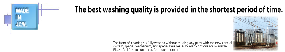 This is a fundamental washing system(Train Wash Plant) for railway carriages consolidating all the know-how accumulated since our foundation. It is a stationary type, and can be installed in a small footprint. Moreover, a carriage can be brought in from either direction for the washing process, thus the system can be installed at a place which was considered not possible in the past. The whole circumference of a carriage up to the shoulders, to say nothing of the sides, is fully washed. The new control system and special mechanism perform the washing by precisely correlating to the shape of a carriage without any need for manual washing.
