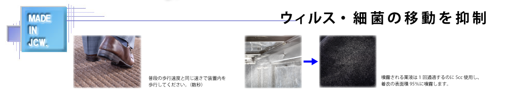 人体(衣類・靴)に付着したウィルス・細菌を、衣類を着たまま、装置内を歩行する事により、洗浄装置で除去します。本装置内を歩行する事で、ウィルス・細菌が、衣類・靴等、社会生活を営む為に身に着けているモノに付着し、移動を繰り返すのを防ぎます。